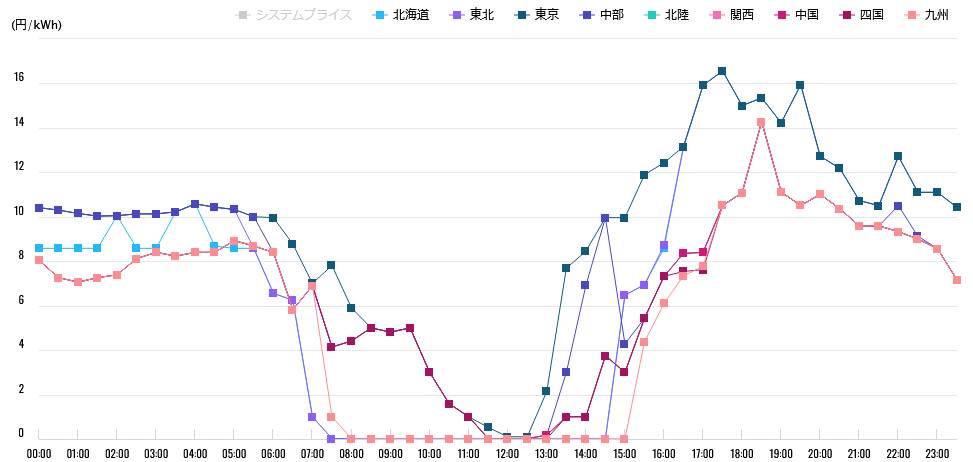 発電電力が大きく需要電力が少ない、九州電力エリアや四国電力エリアでは日中の時間帯ではほぼ0.01円の価格となっています。一方で需要の大きい東京電力エリアでも日中の時間帯は1円以下の約定価格となっているのがわかります。