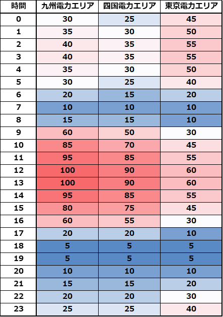 - 九州電力エリア: 10時〜15時が「100」に近い値となっており、出力抑制制御が頻発する時間帯と一致します。最も充電ビジネスの優位性が高いエリアとして表現できます。